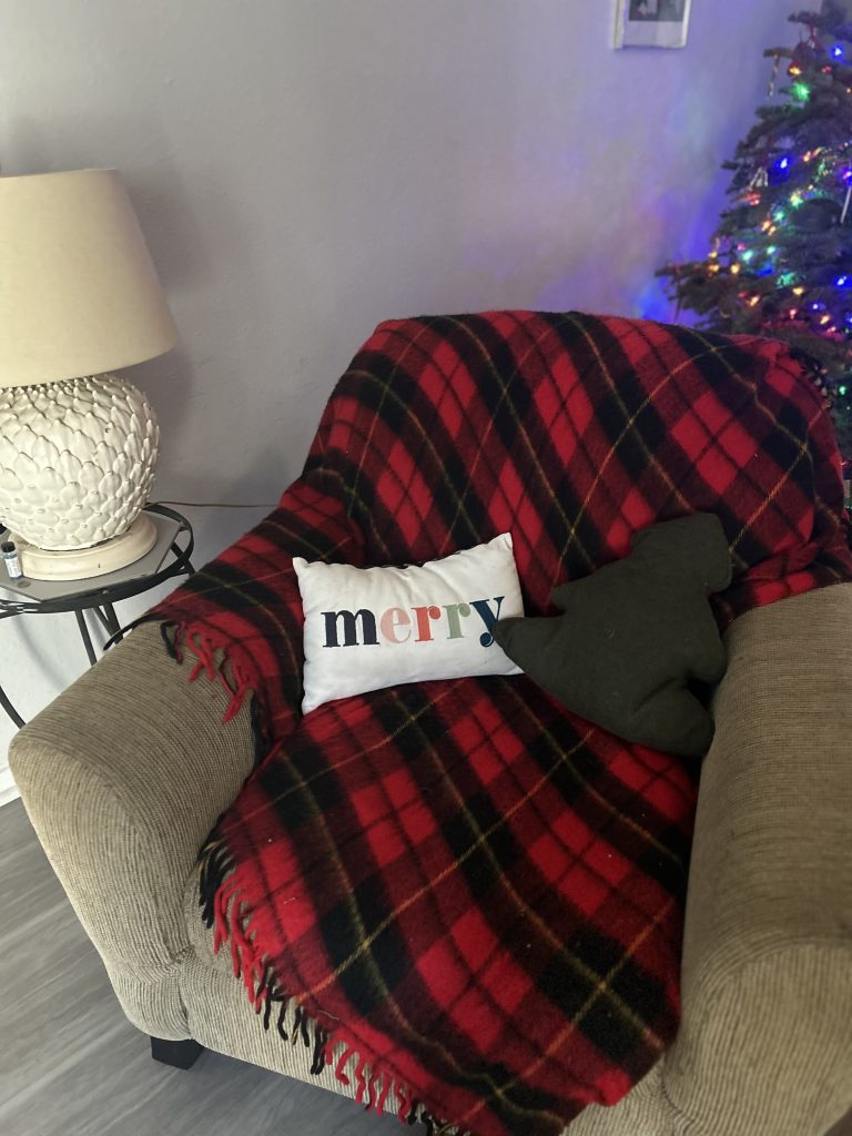 A few weeks ago, I ventured to the thrift store and a few yard sales on a Saturday morning and lucked out with the things I found! I found a beautiful red, plaid throw, candlesticks made from yarn looms, holly berry mugs, and an Annalee mouse that is so perfect for my Christmas decor!