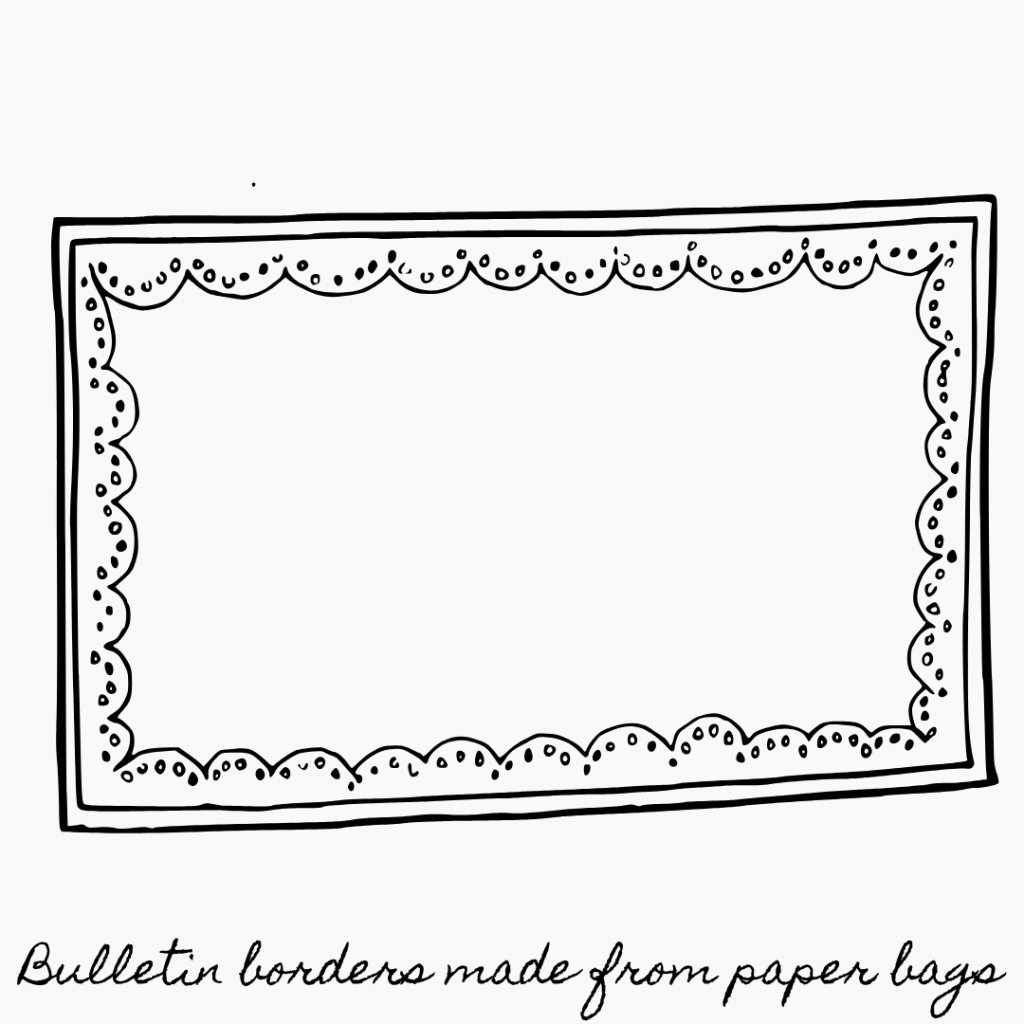 Decorate bulletin boards with plain craft paper and bulletin borders made out of artwork or recycled paper bags. I like to cut recycled paper bags into a scalloped edge and use a hole punch to embellish the edges. I also like to create banners out of cardboard with cut out letters.